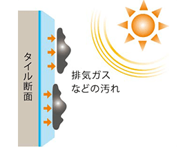光触媒作用によって生まれた分解力で、タイル表面に付いた汚れの付着力が弱められます。排気ガスなどの汚れにも、効果を発揮します。